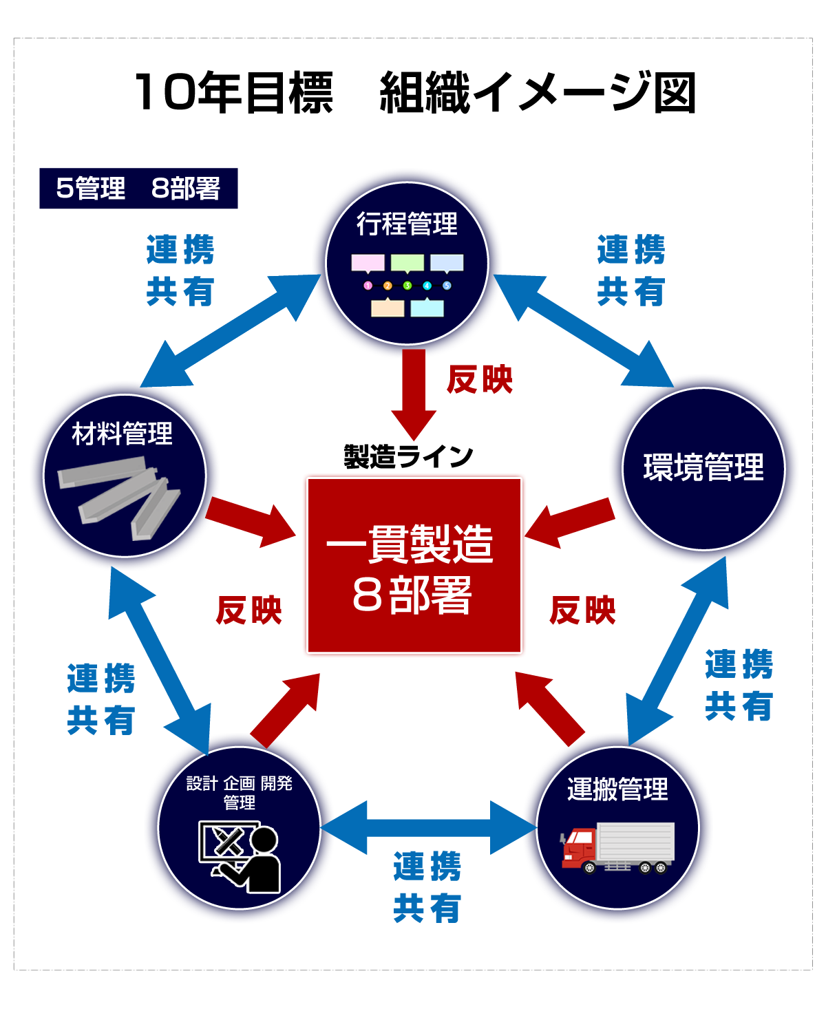 このビジョンの達成に向けて、以下の5つの重要な管理領域を徹底的に強化し、8つの部署を立ち上げ、一貫製造会社としての地位を確立します。
